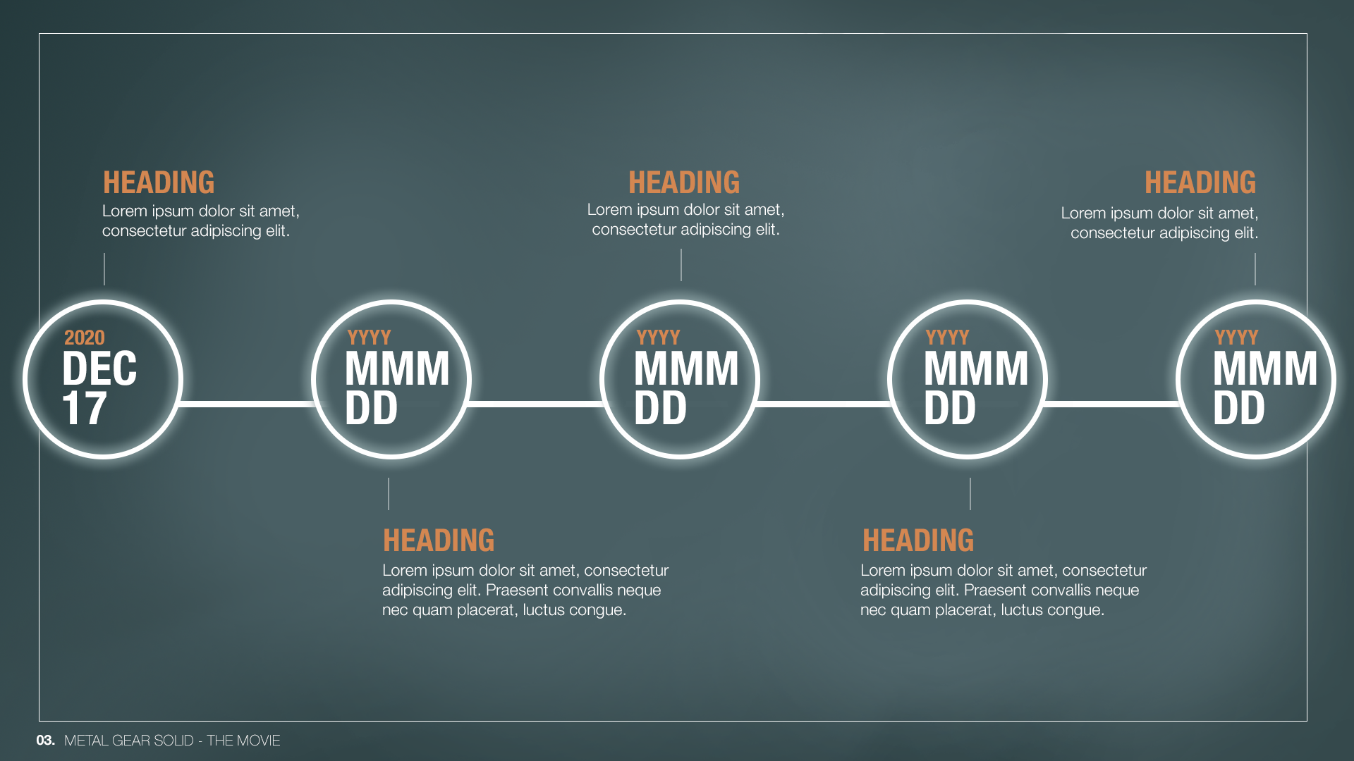 A templated pitch deck for the potential film, Meal Gear Solid. Created for Tangent Agency as a design pitch, not used by official studio or any agency.